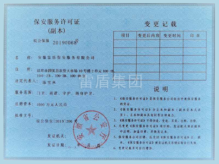 安徽雷盾保安服務(wù)有限公司是一家集物業(yè)管理、勞務(wù)派遣、保潔服務(wù)、保安服務(wù)、綠化養(yǎng)護(hù)工程為一體的企業(yè)。公司經(jīng)過(guò)多年不懈努力以江蘇雷盾智慧物業(yè)服務(wù)集團(tuán)有限公司為核心正在籌劃成為集團(tuán)公司的目標(biāo)而努力奮斗,目前江蘇雷盾智慧物業(yè)服務(wù)集團(tuán)有限公司對(duì)外投資的下屬公司有江蘇雷盾保潔服務(wù)有限公司、安徽雷盾保安服務(wù)有限公司、安徽雷盾演藝文化傳媒有限公司...